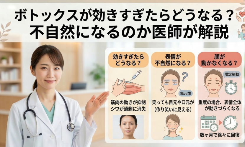 ボトックスは適切な量で施術すれば自然な仕上がりを目指すことができますが、量や注入位置によっては 効きすぎた状態になることもあります。