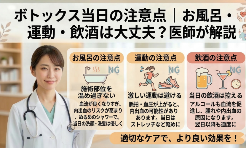 ボトックスはダウンタイムが少ない治療ですが、施術当日は注意していただきたいことがあります。