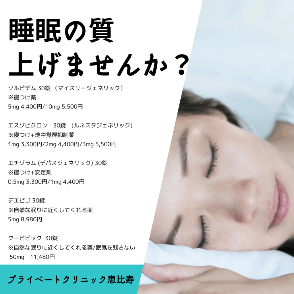 プライベートクリニック恵比寿では、不眠症に対して ゾルピデム(マイスリージェネリック)・エスゾピクロン(ルネスタジェネリック)・エチゾラム(デパスジェネリック)・デエビゴ(レムボレキサント)・クービビック(ダーリドレキサント) といった複数の睡眠薬を医師の診察に基づき処方しています。