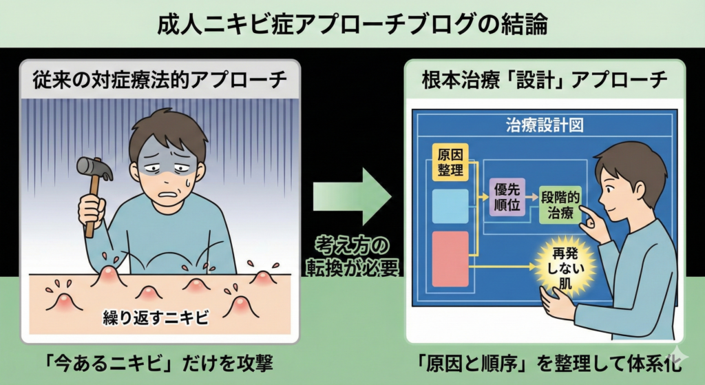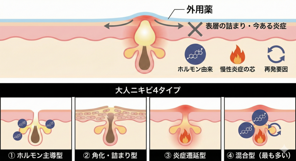それでも、完全には治らないし繰り返す。大人ニキビで来院される多くの方が、同じ言葉を口にされます。まず最初にお伝えします。