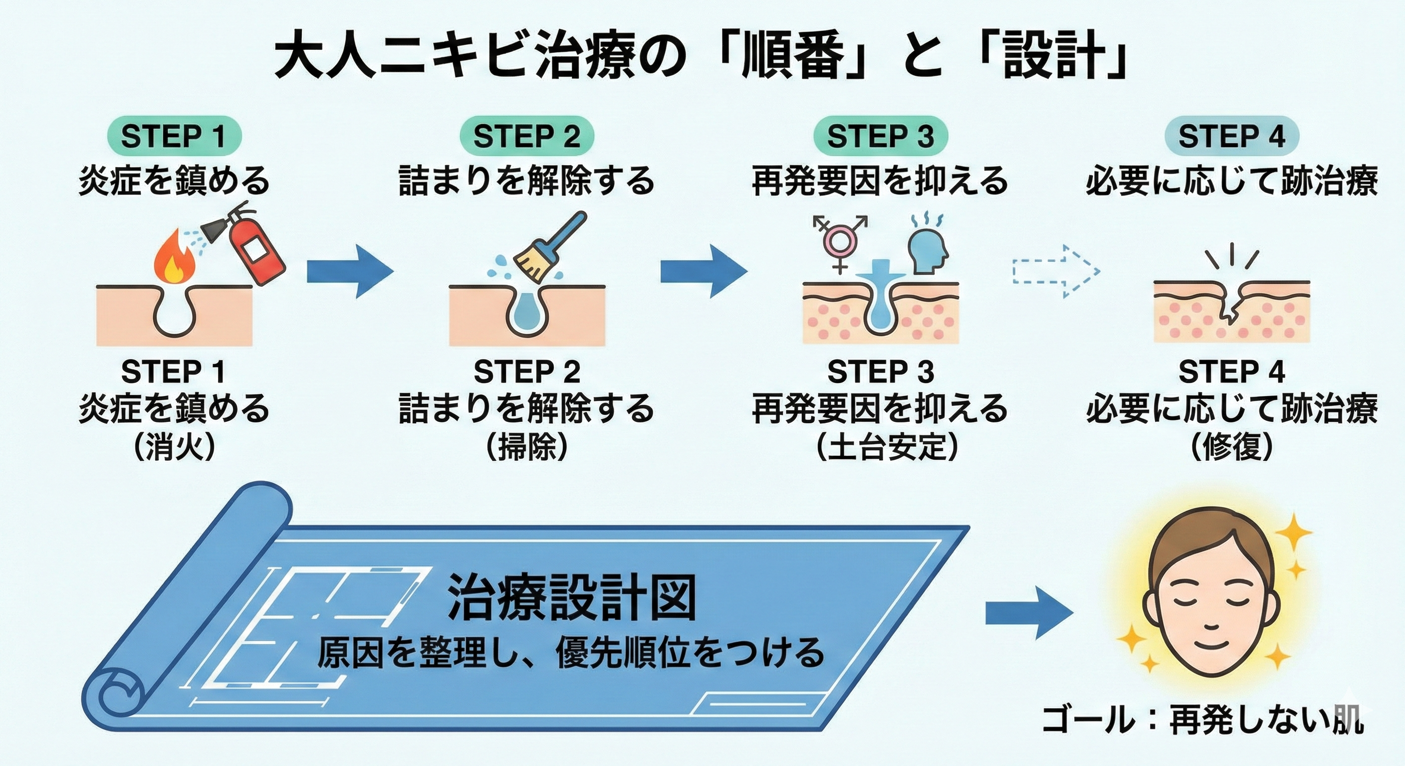 大人ニキビ治療で最も重要なのが 順序 です。この順番を無視すると、