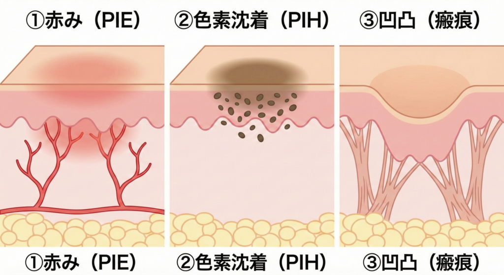 大人ニキビ後に残る変化は、大きく3つ。