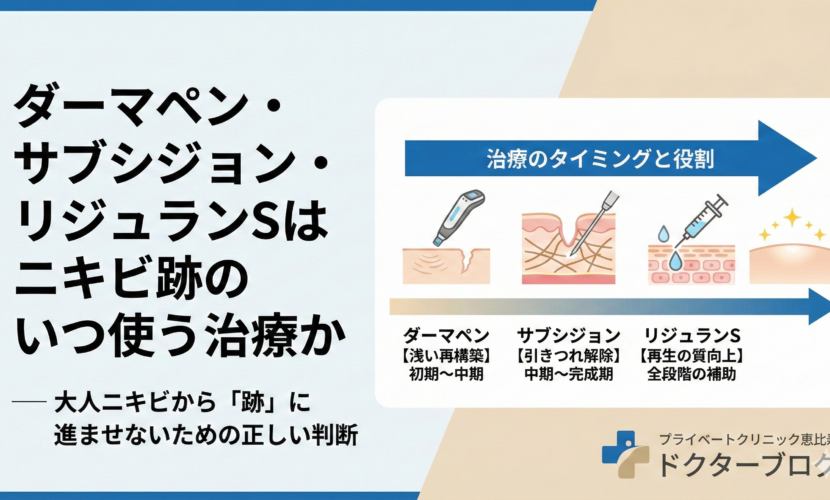 プライベートクリニック恵比寿では、ニキビ治療が安定する前にいきなり跡治療は行いません。