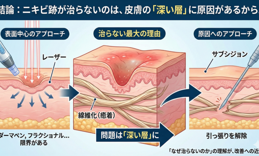 ニキビ跡サブシジョンの全体像(効果・限界・向き不向き)は、こちらの記事で体系的に解説しています。
