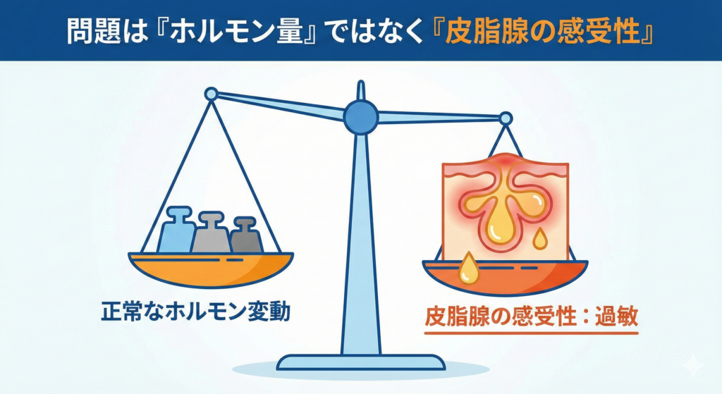 を指します。つまり問題は、ホルモンの「量」ではなく皮脂腺の「感受性」です。