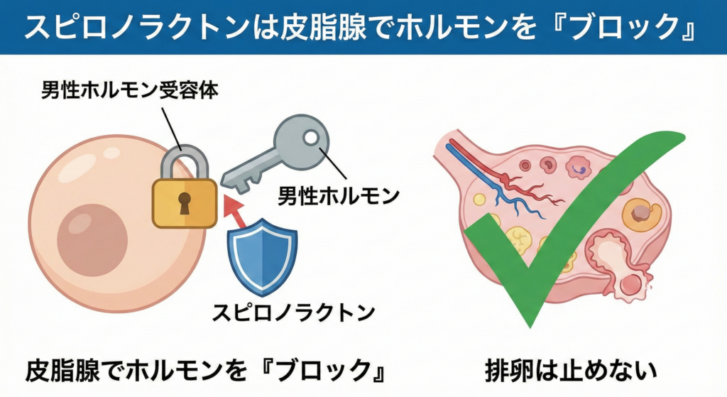 スピロノラクトンは、男性ホルモン作用を皮脂腺レベルで穏やかに抑制します。