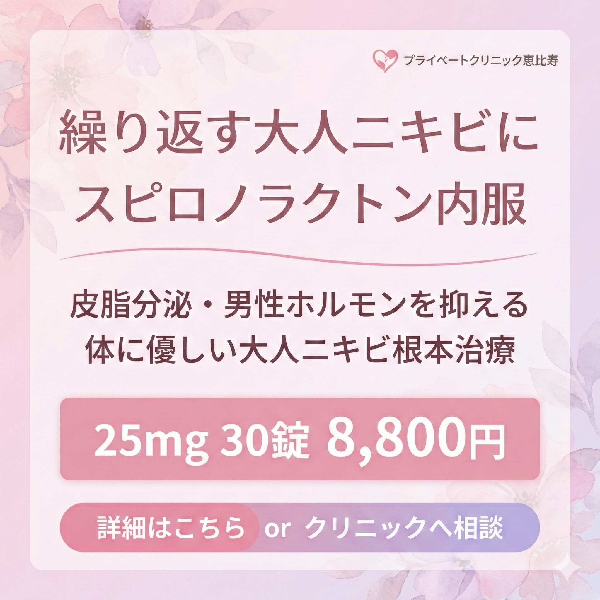 プライベートクリニック恵比寿では、ホルモン性大人ニキビを「体質」ではなく治療設計で安定させる状態と捉えます。症状・周期・部位を整理し、必要最小限で長期安定を目指します。
