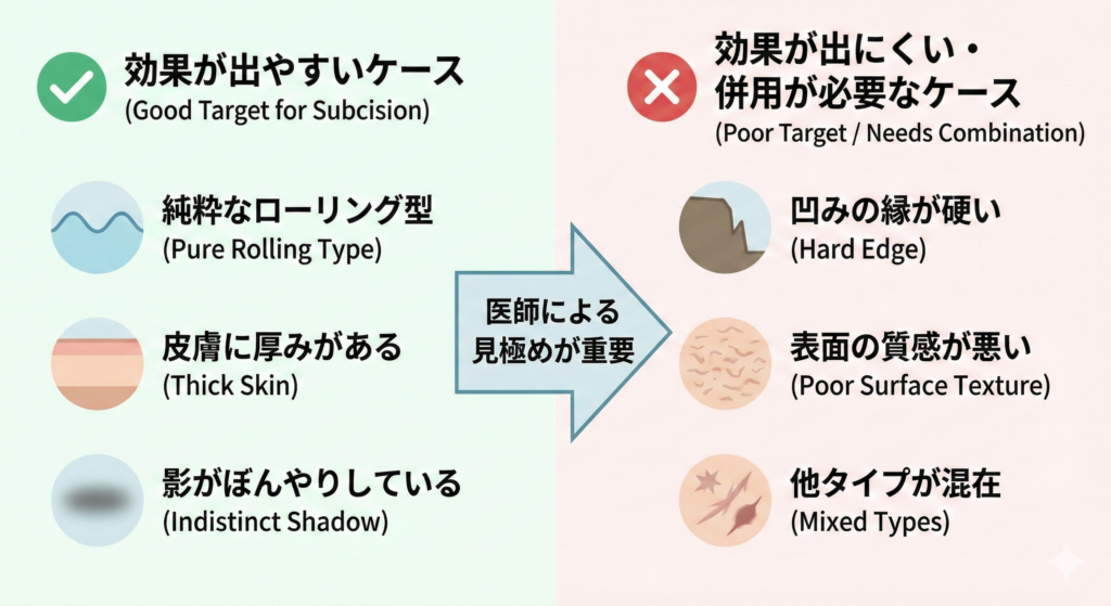 ローリング型ニキビ跡は、サブシジョン治療が最も効果を発揮しやすいタイプです。