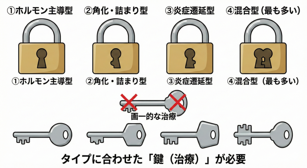 大人ニキビは、タイプによって治療が全く異なります。