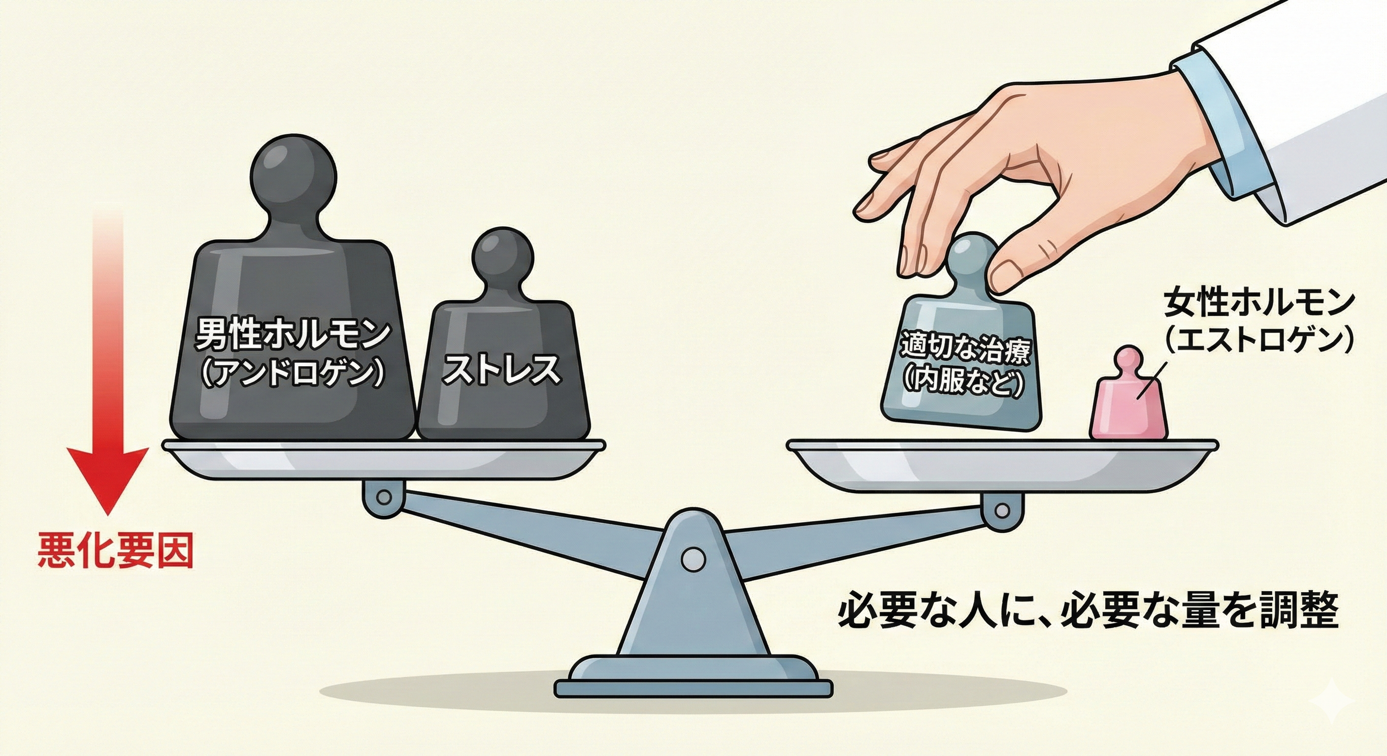 顎・フェイスラインの大人ニキビでは、ホルモンの影響を無視できないケースがあります。ただし重要なのは、