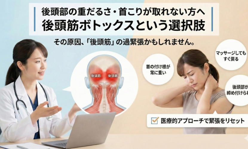 後頭筋ボトックスは、**首こり・後頭部の不調に対する“医療的アプローチ”**です。長年の不調でお悩みの方は、一度ご相談ください。