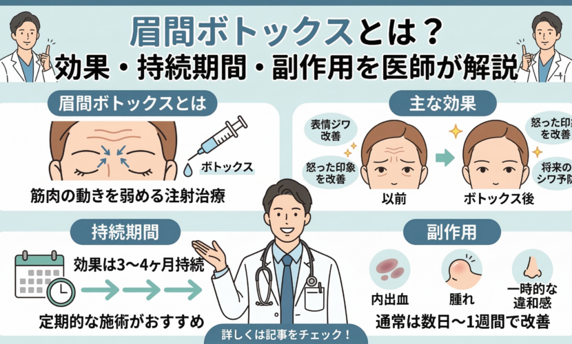 眉間ボトックスは安全性の高い治療ですが、次のような副作用が起こる可能性があります。