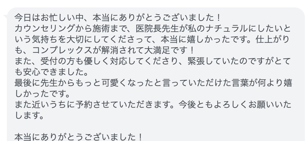 カウンセリングから施術まで、院長先生が「ナチュラルにしたい」という気持ちを大切にしてくださって、本当に嬉しかったです。仕上がりも、コンプレックスが解消されて大満足です!受付の方も優しく、緊張していましたがとても安心できました。最後に先生から「もっと可愛くなった」と言っていただけたことが何より嬉しかったです。