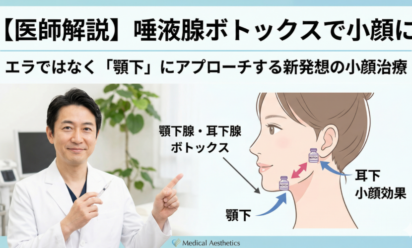 そこで注目されているのが「唾液腺ボトックス」です。下顎の内側に存在する顎下腺(がっかせん)と呼ばれる唾液腺に少量のボトックスを注入することで、腺の体積を縮小させ、顎下のシルエットをスッキリと整える治療法です。