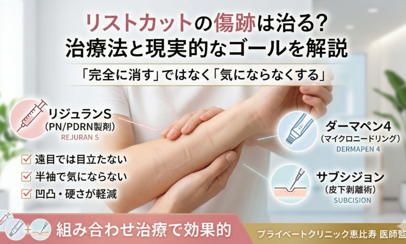 傷跡を完全に消すことは難しいですが、目立たなくすることは十分可能です。当院の治療法(リジュランS・ダーマペン4・サブシジョン)の効果と限界を、医師の立場から正直にお伝えします。